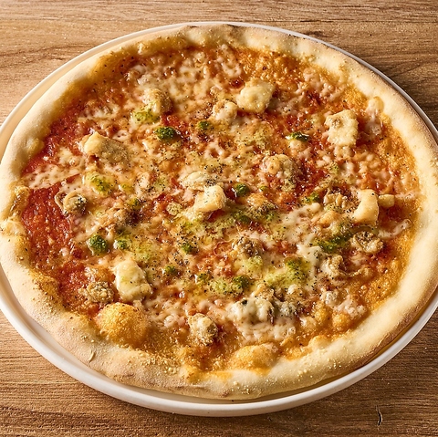 トマトベースのシーフードピザ。グリーンチリソースがアクセント!
