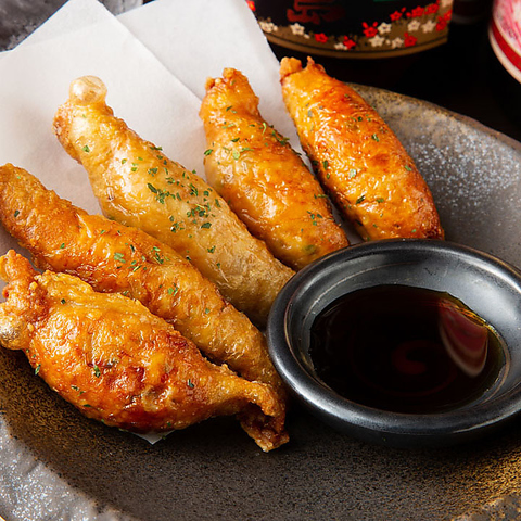 当店自慢の人気メニュー☆「秘伝手羽先の唐揚げ」是非この1品は、ご来店なさったお客様全員に食べてほしい1品になっております。当店自慢の「秘伝のタレ」に漬け込んだ1品は外はカリッ、中は鶏肉の旨味と秘伝のタレがマッチして、頼まずにはいられない主力の一品となっております!尚、当店ではこの1品を1人でも多くのお客様に味わってもらいと各種コースのメニューとして全コースに入れさせてもらっています。是非一度、ご来店なさった際には是非味わって下さい!