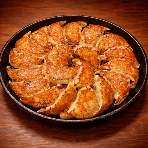 【名物。鉄鍋餃子】オーダー率は当たり前の100%!しかもお替り率も90%を超えるとか超えないとか…。夜12時来店でも平気で20~30個行けちゃうのが「ぎょうざ家」の餃子!なんでかって…?店主が日本全国を食べ歩いてたどり着いた究極の逸品だからこそ!!熱々。自慢の【焼き餃子】を喰らえ!