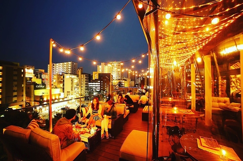 ♪天神の夜景を一望できる開放感満点な空間♪素敵なひとときを◎春から秋までオープンテラス席、冬は暖房効いたテントでゆっくり仲間内でワイワイお食事なんかも出来ます。