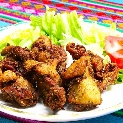 大分名物唐揚げが…南米風に変身!!衣がついていないので、何個でも食べられます★アンデスの香草で味付けした風味豊かなしっかり味のついたオーナーオススメの一品です!