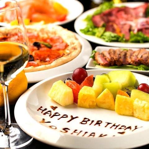 お祝いのパーティーには欠かせないメッセージ入りのデザートプレートはクーポン利用で無料サービス♪たっぷりのフルーツに思い思いのメッセージをのせて…、照明を落としたり音楽を変えたり皆様の演出のお手伝いもおまかせください!写真入りのオリジナルケーキの手配も可能です、一生の思い出に残るサプライズにどうぞ。