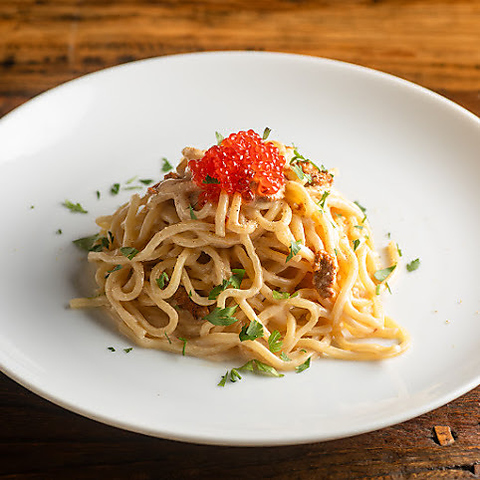 当店で使用するパスタは独自に開発した特製麺を使用。モチモチの食感や小麦本来の味や香りをお楽しみいただけます。シェフのおすすめは『北海道ズワイガニと雲丹のクリームソース』。固形状態の雲丹をソースに入れることで、濃厚な旨味や風味がソースに溶け込み、味わい深い逸品に。皆様でシェアしてお召し上がりください。