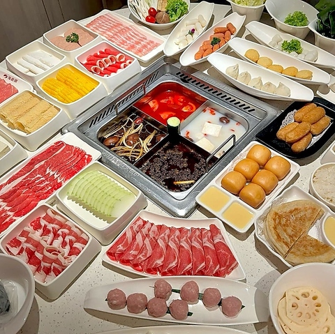 五感すべてで愉しむ海底撈特製の火鍋はコースでご賞味いただけます。☆スープの組み合わせは以下からお選びいただけます。麻辣スープ・白湯スープ。麻辣スープの辛さはご調整いただけます。☆調味料23種類、果物、漬物、すべてセルフサービスです。☆お飲み物は別途ご注文となります。