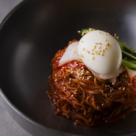 福岡・渡辺通で本場韓国の味を!釜山名物「ビビンミルミョン」がマダンセで大人気です。小麦粉から作られる独特の強いコシが特徴の麺に、釜山出身のオンマ特製の甘辛いヤンニョムダレをたっぷり絡めて味わう至高の一杯!一口食べれば、深い旨味と爽快な辛さが口いっぱいに広がり、お箸が止まりません。価格は1200円(税込)。福岡では提供店が少ない希少な絶品旨辛麺を、自慢の本格韓国料理と共にぜひ一度ご堪能くださいませ!
