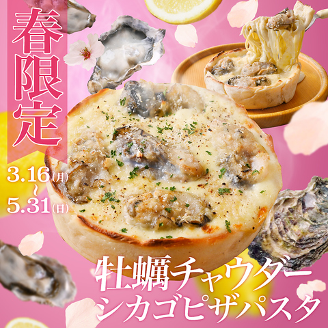 肉厚な春牡蠣とパスタが溢れ出す進化系シカゴピザが春限定で新登場!バスケット型の生地に、もちもちパスタと特製ソースがぎっしり。ナイフを入れた瞬間、香りと共に”ぷりっぷり”の牡蠣が溢れ出します!濃厚なチャウダーとチーズの夢の融合。シェア必須の背徳感をぜひご堪能ください!※3/16(月)~5/31(日)限定