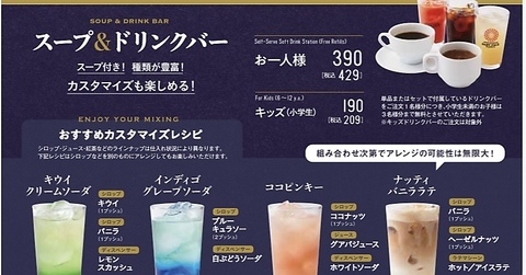 - スープ&ドリンクバー ※スープ付き!種類が豊富!カスタマイズも楽しめる!