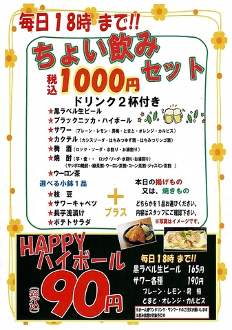ドリンク2杯・小鉢1品・揚げ物、焼き物どちらか1品チョイス。1000円