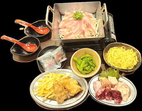 名物とんちゃん焼き(ちりとり鍋)・自慢のすだち鶏唐揚げ枝豆・ポテトフライ・鍋のお肉3点盛り・苺アイス