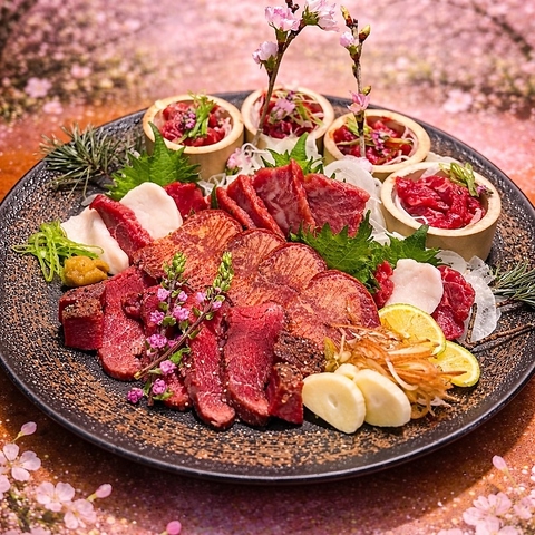 熊本・信州直送の桜肉を贅沢に盛り合わせ。赤身・コウネ・ロースト・馬タンなど、五種の旨さを一度に楽しめる特別な一皿。半解凍のルイベで味わうことで、シャリっと、とろける桜肉本来の旨みが広がります。今日は少し贅沢に。桜肉で、いい夜を。