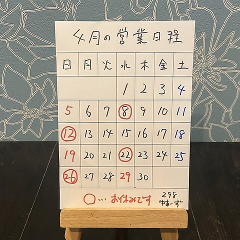 基本日曜日定休・日曜含む連休の場合、最終日がお休みです。 たまにイレギュラーありです・カレンダーご参照ください! |