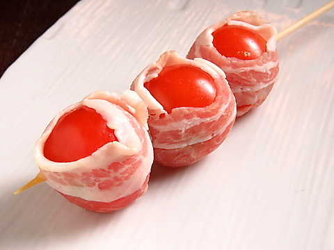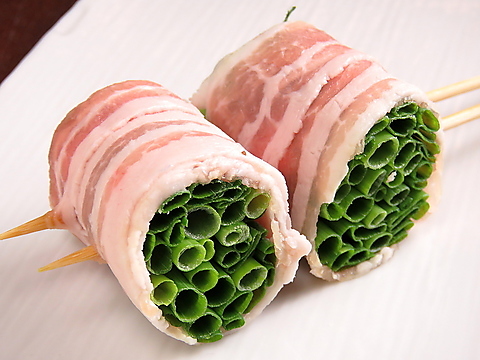 定番人気野菜豚巻串!種類豊富にご用意しておりますので、思う存分野菜豚巻き串をご堪能下さい☆野菜たっぷりヘルシーなので、食べ過ぎても大丈夫!野菜は熊本県産野菜を多く使用した野菜巻き串♪