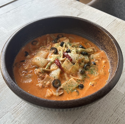 デュラムセモリナ100%とお水からお店で製麺している自慢の自家製生パスタでもちもちです♪もっちもち感にとにかくこだわろうとお店で製麺してねかせることで熟成させています。単品パスタ金額+780円で豆乳スープ・サラダ・ドリンク・デザートまでつくお得なセットもございます。