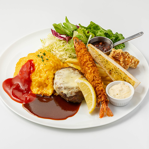 大人も大満足!ハンバーグ・エビフライ・オムライス・唐揚げを盛り合わせた「大人様プレート」☆ランチにも