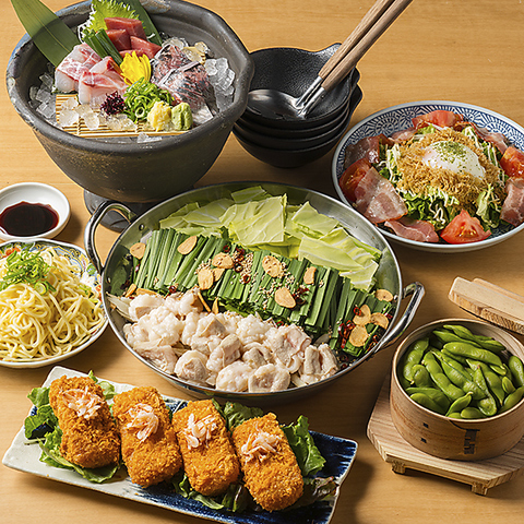 春キャベツたっぷりもつ鍋のほか、お造りや揚げ物もご用意しております。豊富な種類のサワーやハイボールの120分飲み放題付き☆プレミアム飲み放題にグレードアップも可能です♪誕生日や記念日、各種ご宴会シーンに最適ですのでぜひご利用ください。