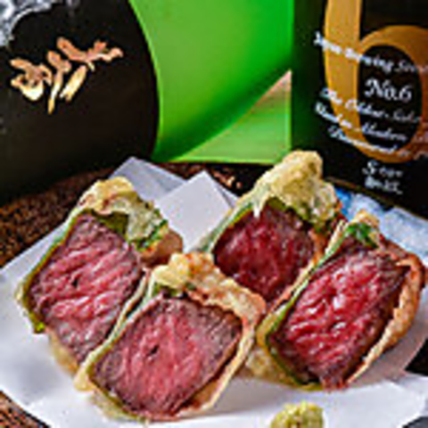 店主の地元佐賀県から直送したA5ランクの佐賀牛のモモ肉を大葉で巻いて天ぷらにしました。絶対に召し上がって頂きたい当店の看板商品です。