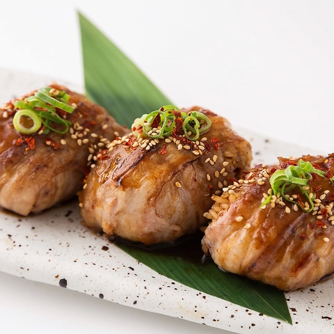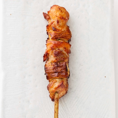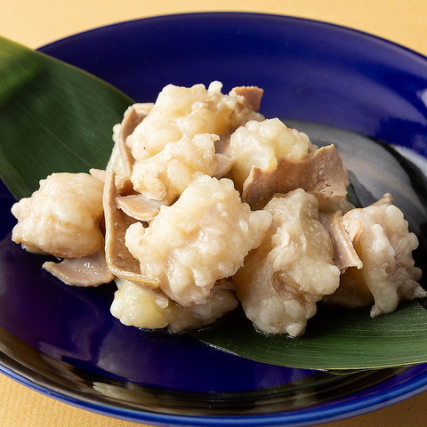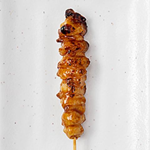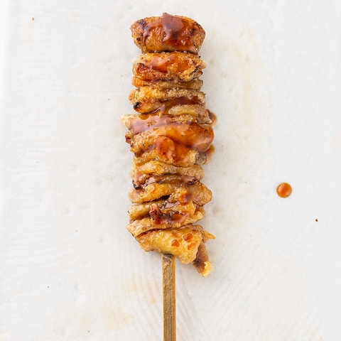 鶏皮と餃子の餡がしっかりマッチ!特製の甘めのタレを絡めました。