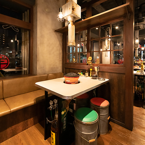 屋台を思わせる灯りのもと、臨場感溢れるカウンター席で自慢のお肉とお酒をお楽しみ下さいませ♪カウンターキッチンのライブ感がお料理をさらに美味しく引き立てます!少人数様でのご利用大歓迎!ちょい飲みやデートに♪