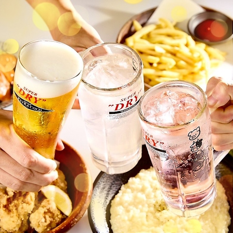 人気のあんかけ揚げ出し豆腐や様々な味のポテト、唐揚げなど全80品がなんと3時間食べ飲み放題!!!+550円でスーパードライエクストラコールド、+1100円で銘柄地酒も飲み放題☆