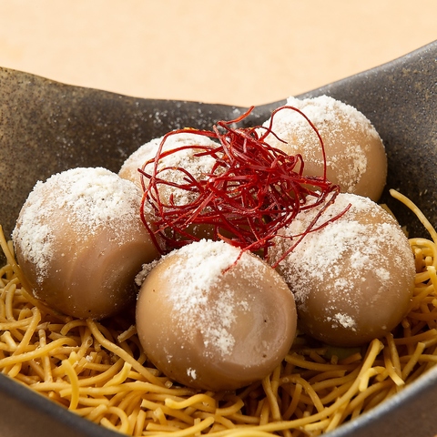 特製醤油でつけたうずらの卵にコクのあるチーズがやみつきになります。