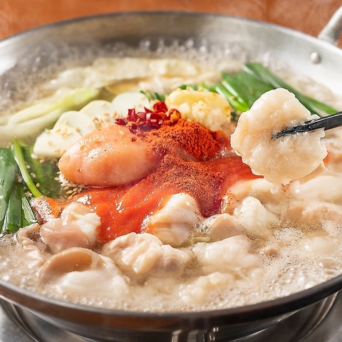 人気名物の明太もつ鍋は、ピリ辛の明太子とぷるぷるのもつが絶妙に絡み合う自慢の逸品!バターの香ばしい風味と、明太子の旨味がたまらない本格派の博多明太もつ鍋を是非ご堪能ください!