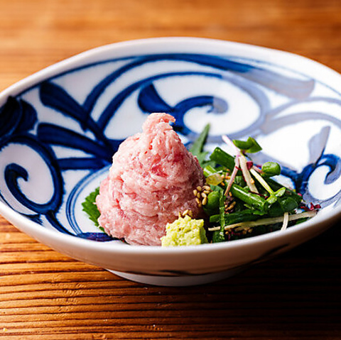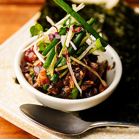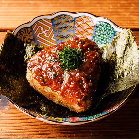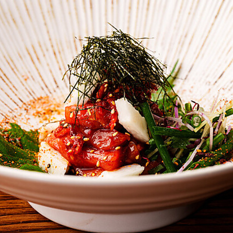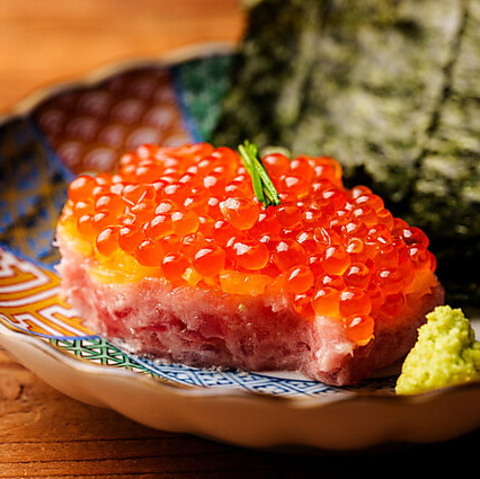 生本マグロを赤酢と梅酢を加えた酢飯に乗せ、炭火を使用しお客様の目の前で炙り仕上げるレアステーキは見た目も華やか!香ばしい炭の香りとトロけるような脂の本マグロは酢飯との相性◎ついつい写真に収めたくなる一品です。