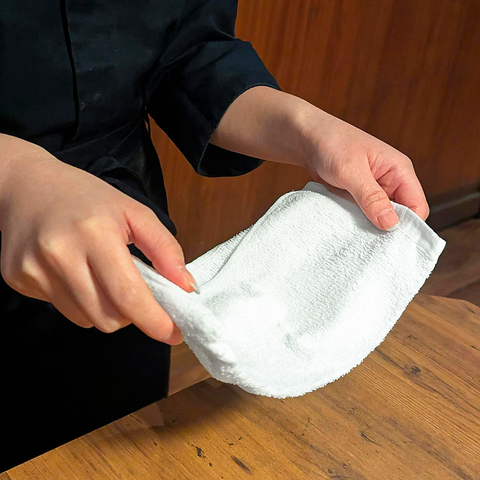 お食事の始まりは、ふかふかのおしぼりから。当店では、肌当たりの良さにこだわった特注の厚手おしぼりをご提供しています。しっかりとした重みと吸水性は、布ならではの醍醐味。細部にまで妥協しない、当店のこだわりをお確かめください。