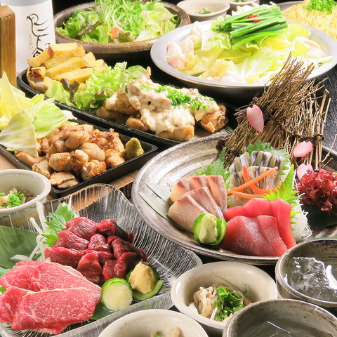 ≪九州魂贅沢コース≫…九州料理を存分に堪能できる贅沢プラン=メイン料理は…名物!博多もつ鍋!他…馬刺しと鶏刺しの二種盛り、国産若鶏のゴロ焼き、鮮魚四種盛りなど全9品。【生ビール含む】種類豊富な飲み放題付き!当日でもコース対応可能です。※お得なご宴会クーポンも使えます♪
