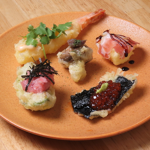 定番の天ぷらとは一味違う、遊び心あふれる「創作天5種盛り」をご用意しました。アンチョビマッシュルームや生ハムカマンベール、贅沢ないくらのせ海苔など、お酒が進むラインナップが自慢です◎さらに大山どり大葉まきや、女性に人気のネギトロアボカドまで、一皿で多彩な味わいをお楽しみいただけます。当店ならではの味をご堪能ください!