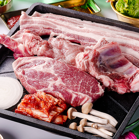 大人気『生サムギョプサル』と『骨付きカルビ』と『生豚肩ロース』を楽しめるお得なセット!鉄板に乗りきらないほどのボリュームです!
