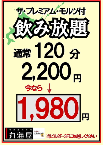 120分飲み放題2,200円が【看板見たよ】でなんと1,980円に!是非お越しください!個室も完備しております。