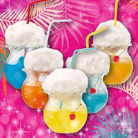 【ふわふわ綿菓子が乗った♪】見た目のインパクト抜群!大きな綿菓子がグラスに乗ったわたがしドリンクは、お子様にも大人気のメニューです◎SNS映えも間違いなし♪ワクワクが詰まったこちらのドリンクは、各980円(税込)でご提供しております。ぜひお食事と一緒に楽しんでくださいね。