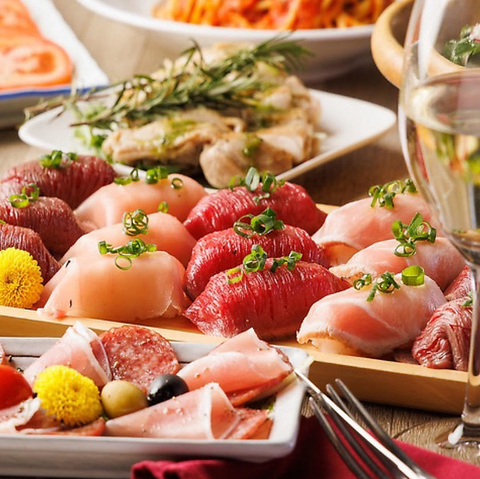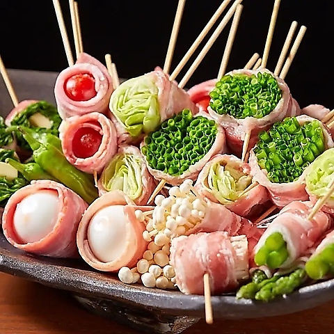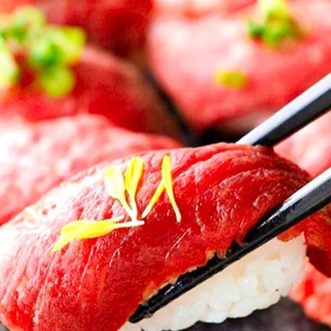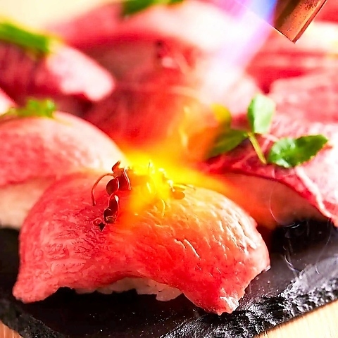 厳選肉寿司&焼鳥!他にも選べるメインなど含む食べ飲み放題付!国産地鶏を使用した炭火焼き鳥は特製の甘みのある秘伝の塾生タレで絶品に仕上げています!そして!当店自慢の黒毛和牛肉寿司は、黒毛和牛を贅沢に炙った旨味溢れる最高級の逸品です。また、常連のお客様からの強いご要望でイチボなど種類豊富に取り揃えております!飲み放題延長も可能!