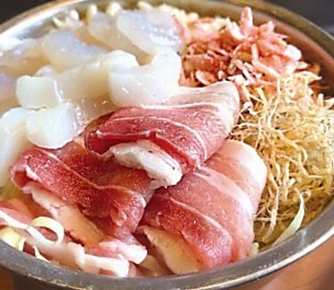 海鮮もんじゃ(海老・ホタテ・いか・干しエビ・さきいか入り)/3種のチーズもんじゃ(3種のチーズ・干しエビ・さきいか)※3種のチーズ(スライスチーズ/パルメザンチーズ/シュレットチーズ)