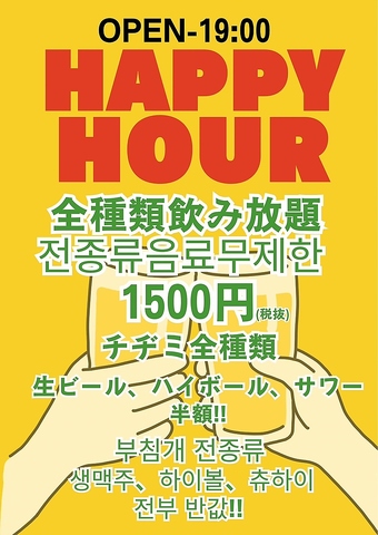OPEN~19時はハッピーアワーでお得に楽しめる!チヂミ半額&サワー・ビール・ハイボールが200~300円に!