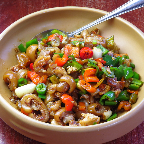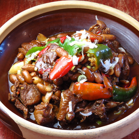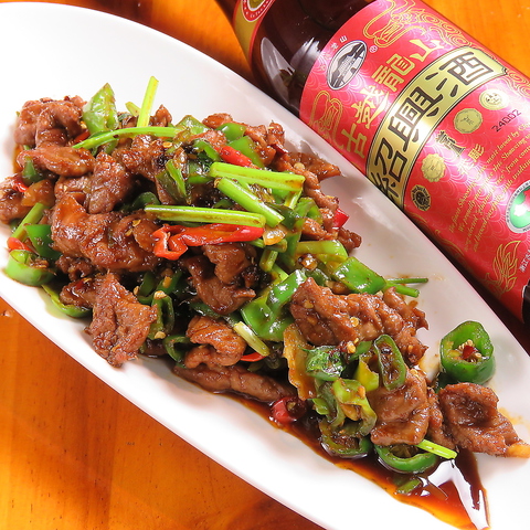 骨を抜きにして食べやすい豚足を、新鮮な赤唐辛子と青唐辛子と強火で炒めた料理です。豚足のもちもちの食感や、唐辛子の辛味で引き立つ旨みがたまらない。コラーゲンたっぷりで女性にもうれしい♪中国酒との相性もいいですよ!
