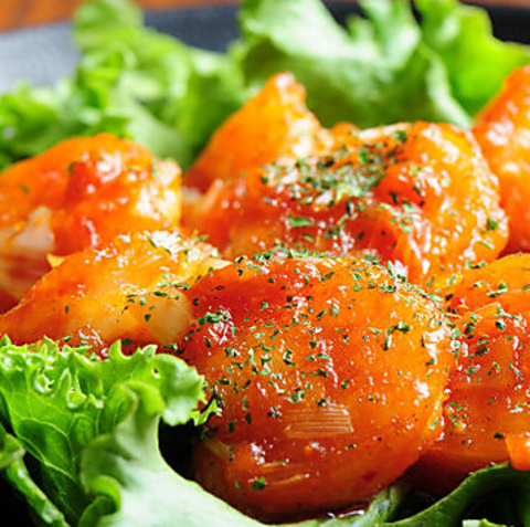 豚肉料理以外にも、新鮮な魚介を使用したメニューが充実しております。大ぶりのエビを贅沢に使い、特製のチリソースで仕上げたこちらの一品は、程よい辛さと旨味が後を引く美味しさです。シャンパンやスパークリングワインとの相性も非常に良く、お祝いの席やお集まりを華やかに彩る、人気の高い海鮮料理です。