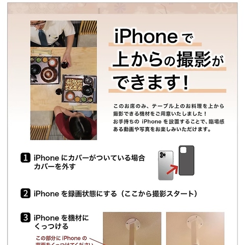 テーブル上からiPhoneで撮影できる席をご用意。料理を真上から美しく収められるだけでなく、お食事の様子や楽しい時間も動画や写真に残せます。思い出の一枚を残したくなる一席です。