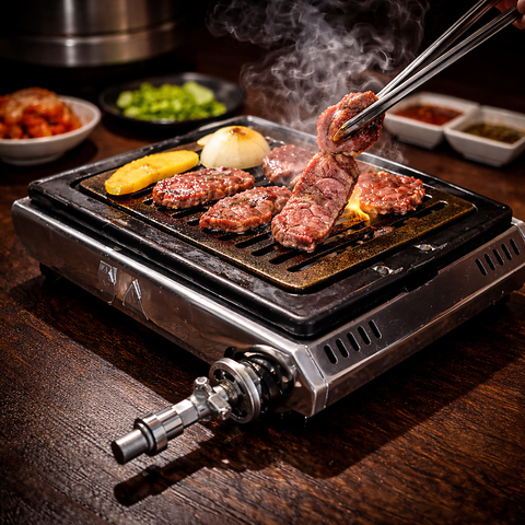当店では、焼肉本来の美味しさを最大限に引き出すため、あえて有煙式ロースターを採用しています。肉を焼くと、滴り落ちた脂が熱源に触れて煙が立ち上ります。この煙には焼肉の美味しさを引き立てる香ばしい香り成分が含まれており、肉全体を包み込むことで、まるで軽く燻したような深いコクと香ばしさを生み出します。