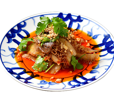 牛スネ肉とハチノスをニンニク辣油で和えた、パクチーとナッツの風味が、ピリッとした辛さの中に爽やかさと香ばしさを感じさせる一品。[アレルギー表示:小麦・落花生/辛さ:中辛]