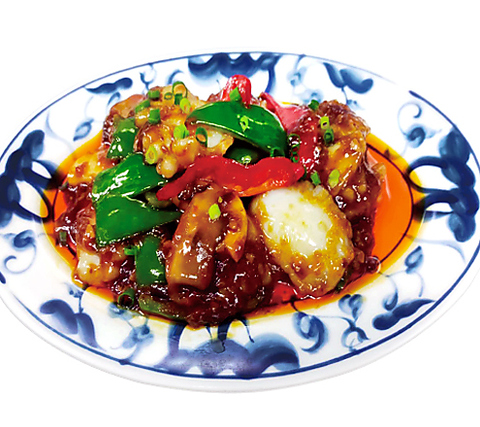 ケチャップを使わない本格派。大ぶりの海老がゴロゴロと入った食べ応えのある逸品です。豆板醤と花椒でピリッと辛みをつけた、ぷりぷりの海老とピリッとした辛さがたまらない逸品!