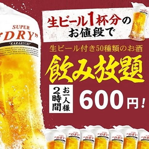 生ビールが付いて驚愕の2H飲み放題が660円!!※金土祝前は20:00以降+550円