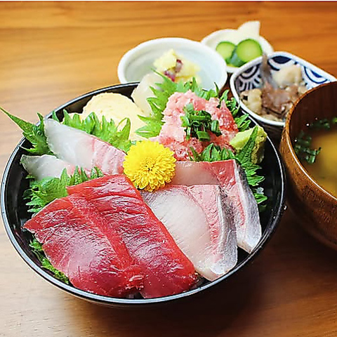 新鮮な魚を使ったランチの海鮮丼はボリュームミーで、味噌汁や小鉢が付いた満足度の高いセッです。