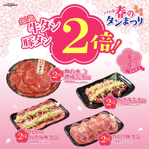 4/6~4/9限定「仙台本家 熟成牛タン」「ねぎ塩タン」「旨とろ豚タン」「旨とろねぎ塩豚タン」が2倍盛りに!