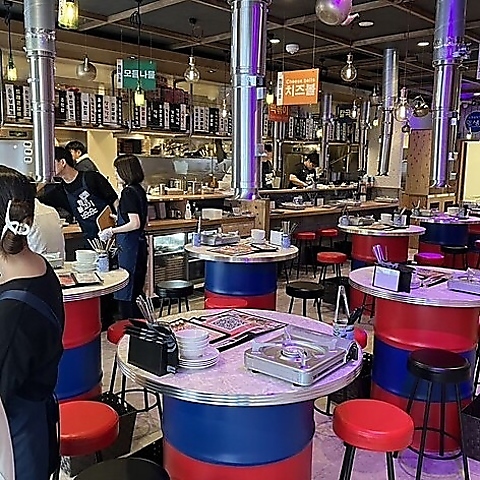 【まるで韓国の屋台街】ネオンサインに誘われ店内に入れば、見渡す限りのハングル語による案内板やカラフルな照明、ドラム缶に天板を載せたテーブルなど、ニュートロな雰囲気の空間が広がります!まるで韓国旅行に訪れたようなトリップ感を楽しみながら、非日常的なひとときをお過ごしください♪