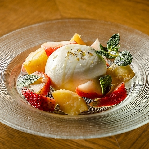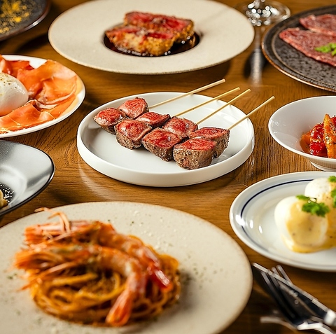 「季節のフルーツとブラッターチーズのカプレーゼ」や「自家製レバームース」等上質な食材を味わう逸品を多数ご用意しております。黒毛和牛ハラミを軽く炙った「黒毛和牛ハラミのカルパッチョ」や「黒毛和牛ユッケとウニの肉寿司」は必食。牛1頭から1人前しか取れない希少部位。舌の上で溶けるような感覚をご堪能あれ。
