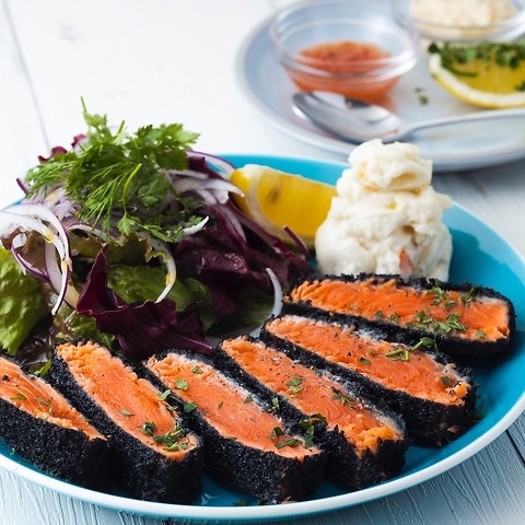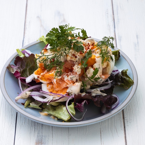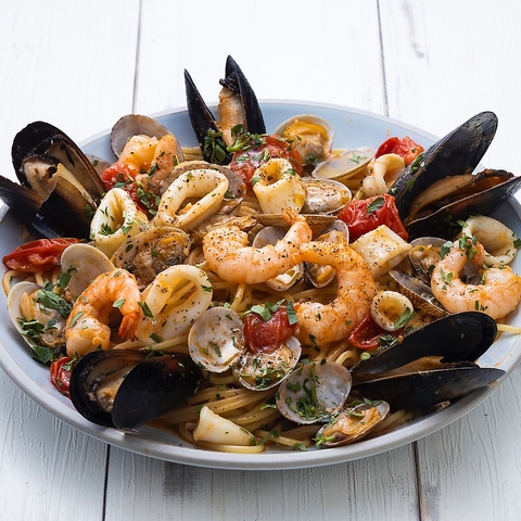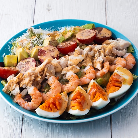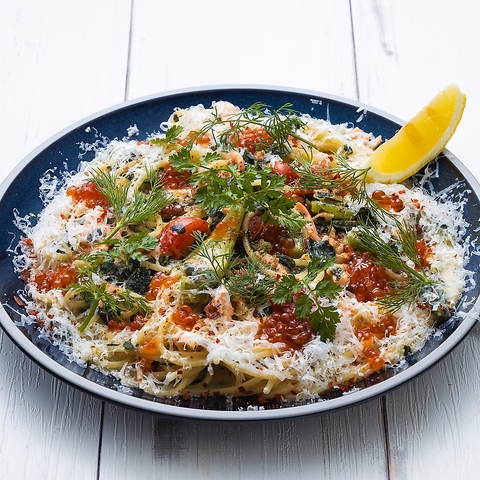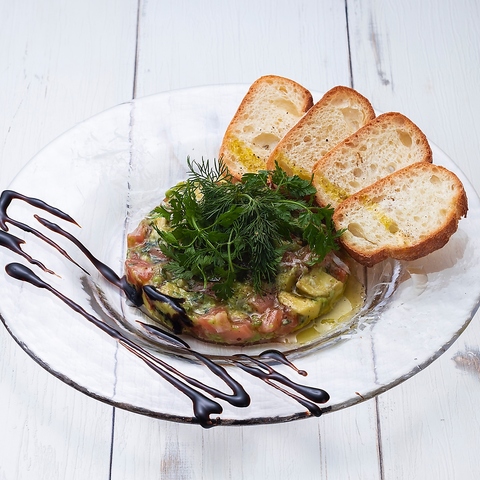 お料理はワインに合うイタリアンの前菜から、ビールに合うアメリカンのおつまみ、がっつり食べられるお肉料理やパスタまで豊富にご用意しています!どれも、食材や調理方法にこだわった自慢の逸品です。中でも、シーフードを使ったサラダや、サーモンのマリネなど、海鮮のお料理はおすすめです。