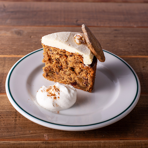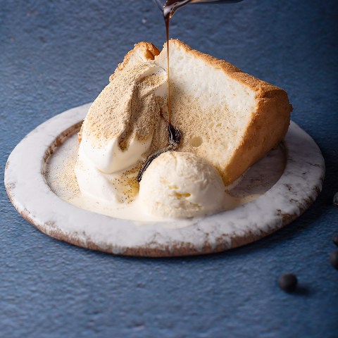 本場アメリカでは定番のこのケーキ。卵白をのみで仕上げたしっとりかつ、フワフワ食感の生地が特徴のシフォンケーキに、純生クリームをたっぷりコーティングし、ヌガータイプの自家製キャラメルソースをかけたMMC*人気No.1メニューです。