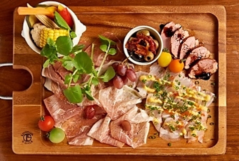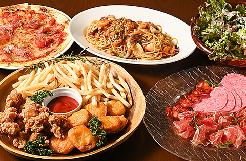 貸切限定の特別プラン。乾杯はシャンパンで華やかにスタート。生ハムやサラダ、揚げ物、ピザ2種やパスタなど人気メニューを揃えた全5品の充実内容。さらにビール・ワイン(赤/白)・焼酎・サワー・ウイスキー・カクテルまで楽しめる3時間飲み放題付き。歓送迎会や各種ご宴会に最適なゆったり過ごせる貸切プランです。