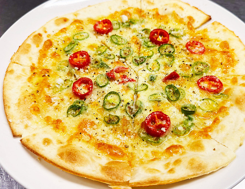 青唐辛子の効いたクリスピーピザ。おつまみに最高!!店長オススメの一品です。